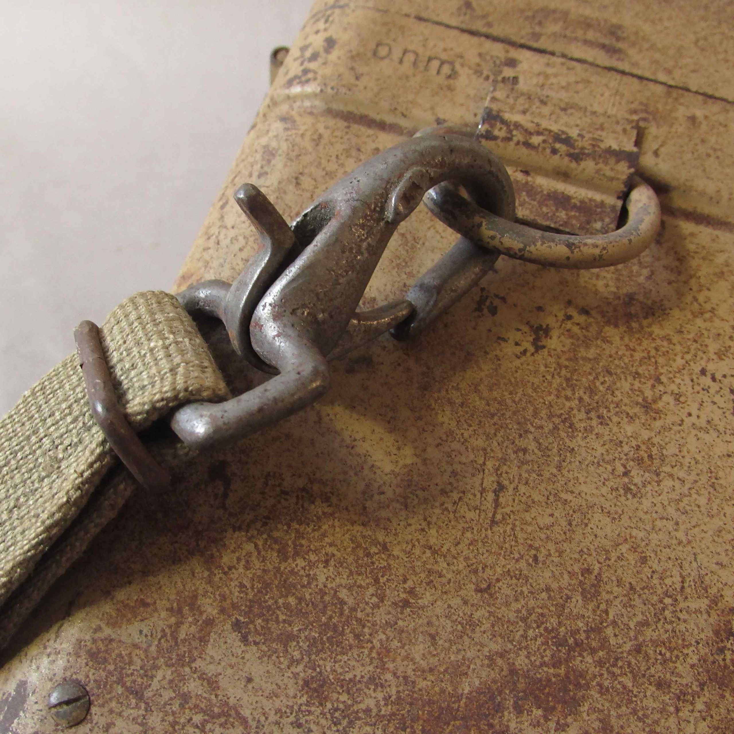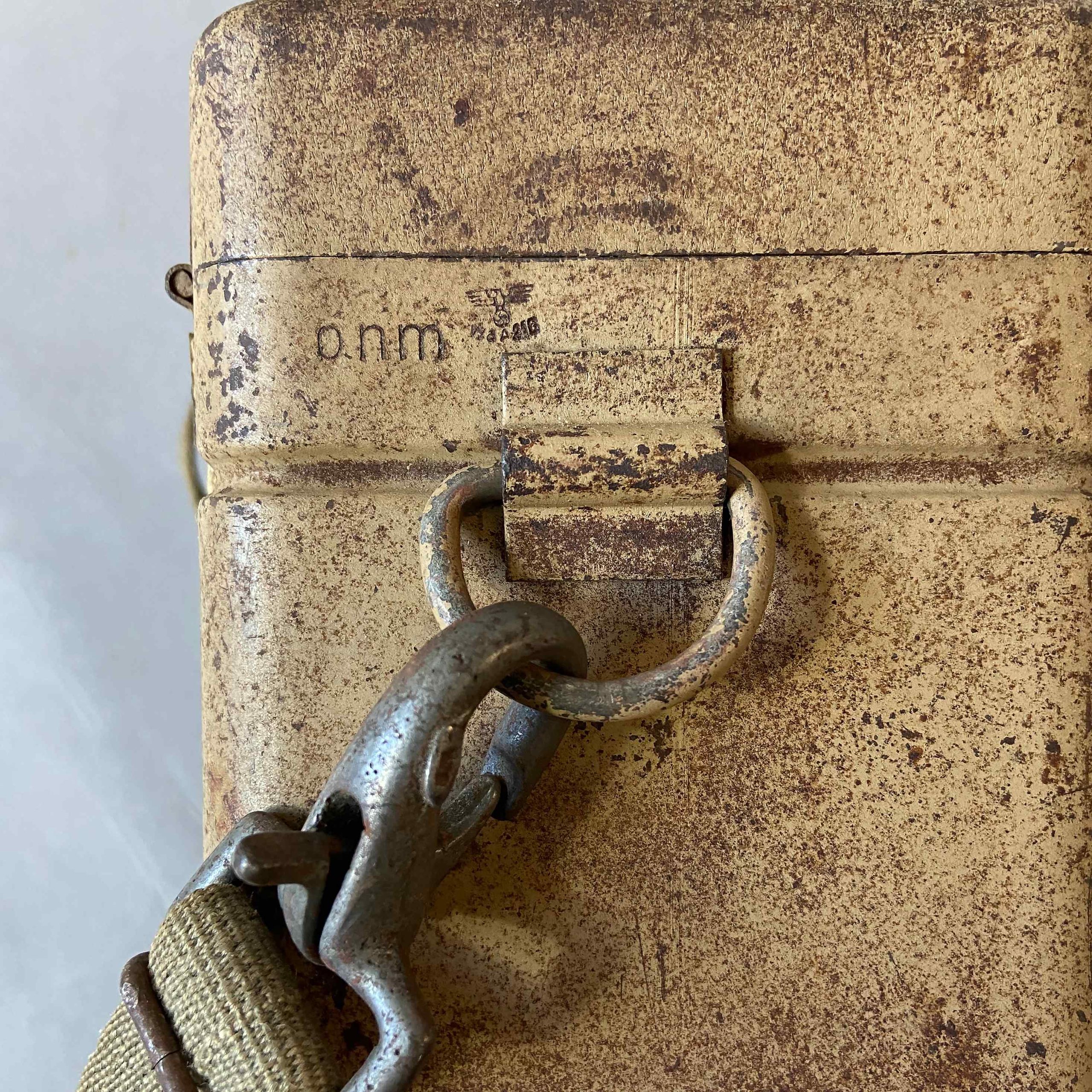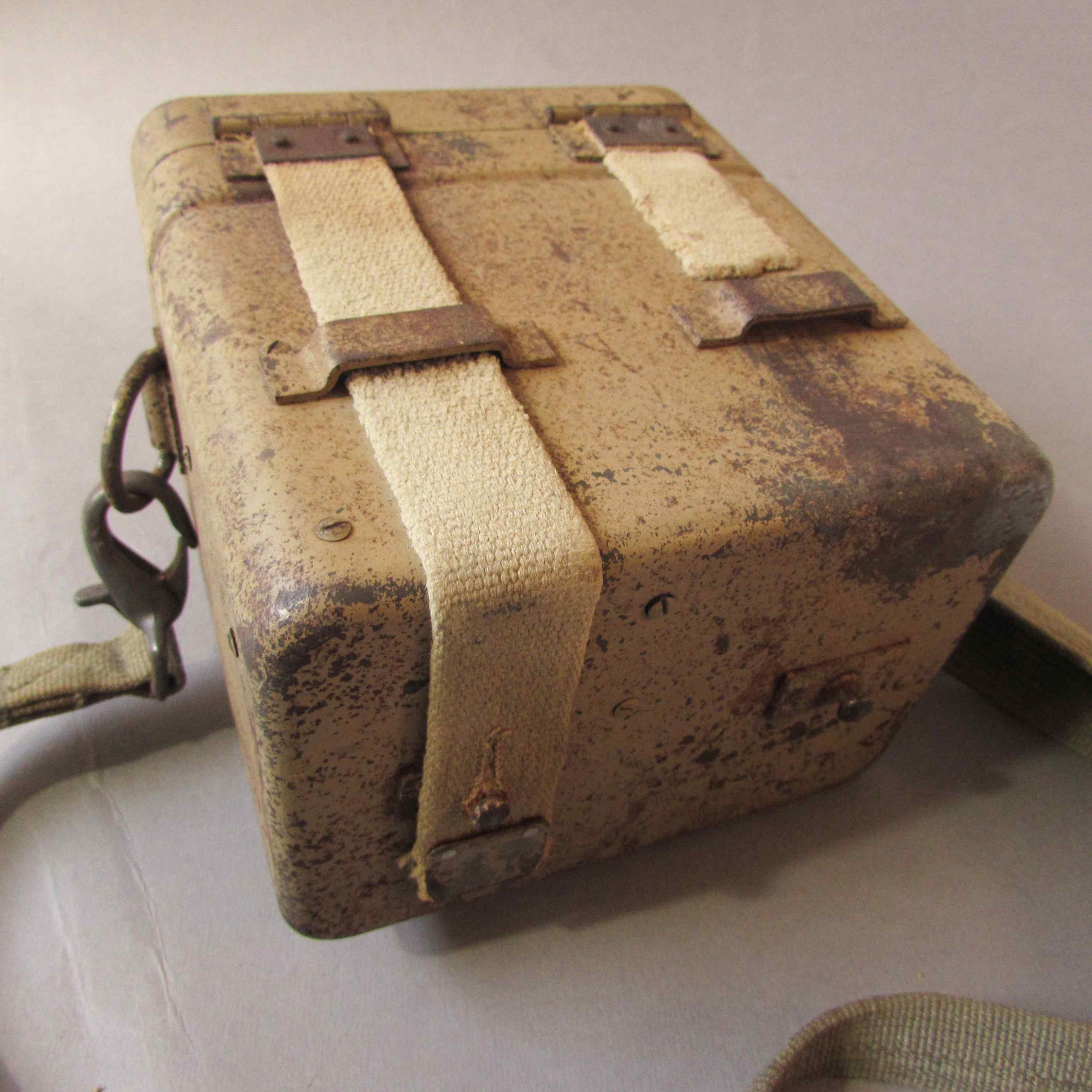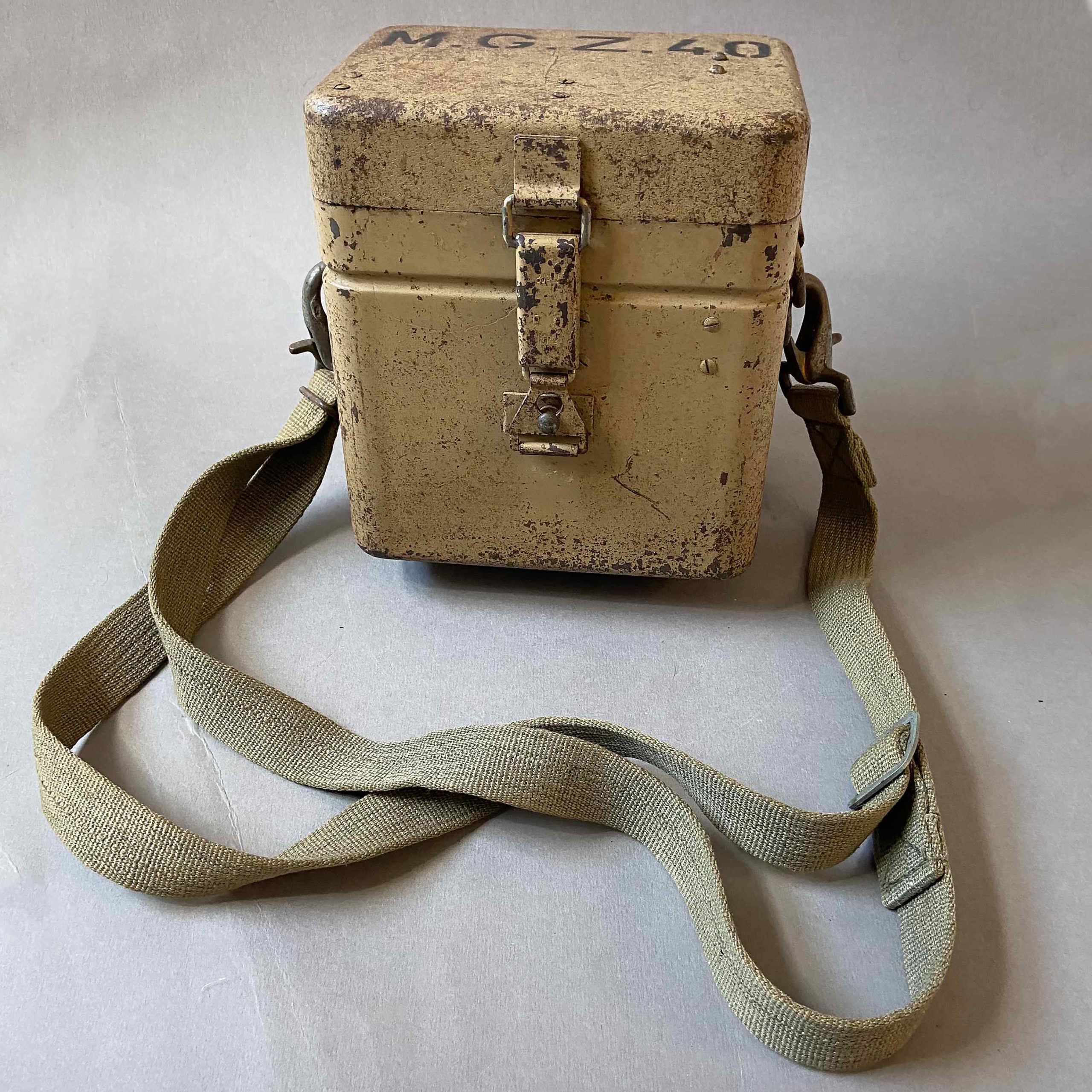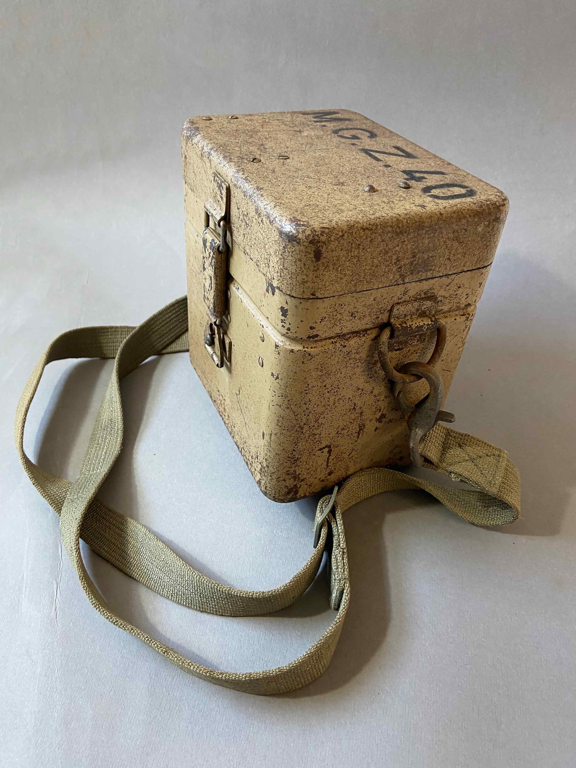 The scope is complete with its original MGZ40 steel carrying case also finished in tan paint.  Complete with 2 yellow optical filters. It has the designation MGZ40 painted in black on the top of the case and is Waffenamt with maker code bnm. The locking mechanism is coded frn42. All internal fittings are present. One of the rear canvas loops has broken away from the back but is still present with the set. The case come with its original carrying strap which is in good condition.